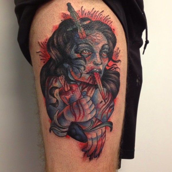 大腿上一款性感时尚的人物肖像纹身图案_肖像纹身图案大全_纹身图吧