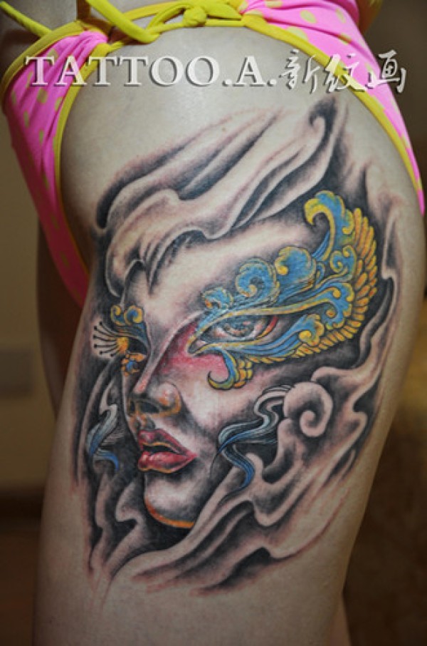 大腿上一款性感时尚的人物肖像纹身图案_肖像纹身图案大全_纹身图吧