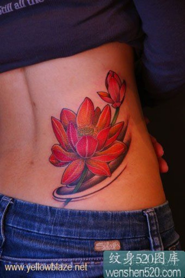 女子腰部火红荷花纹身作品_腰部纹身图案大全_纹身图吧