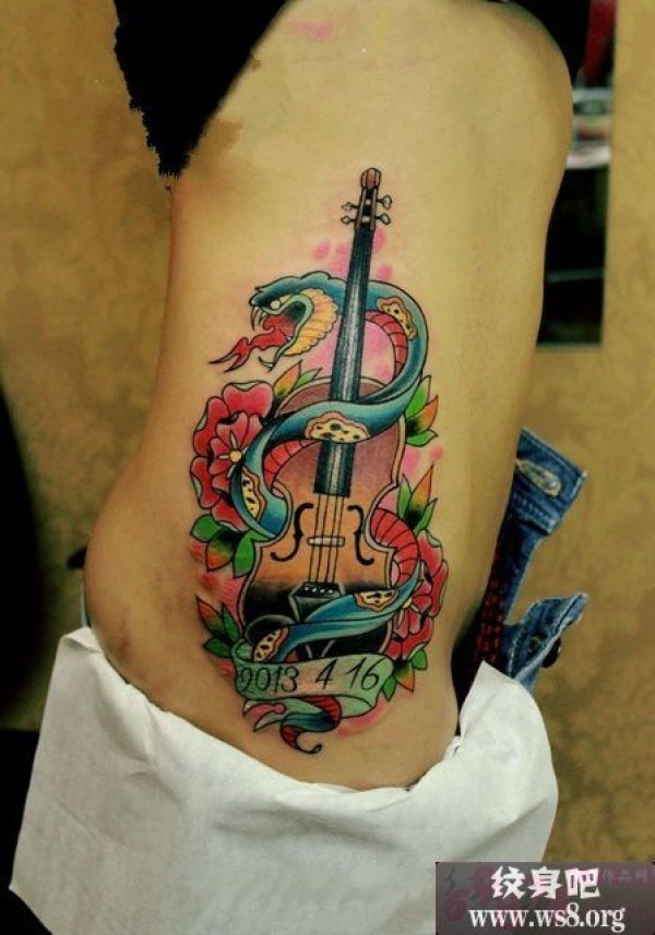 腰部的眼镜蛇与吉他yanjingsheyujita_腰部纹身图案大全_纹身图吧