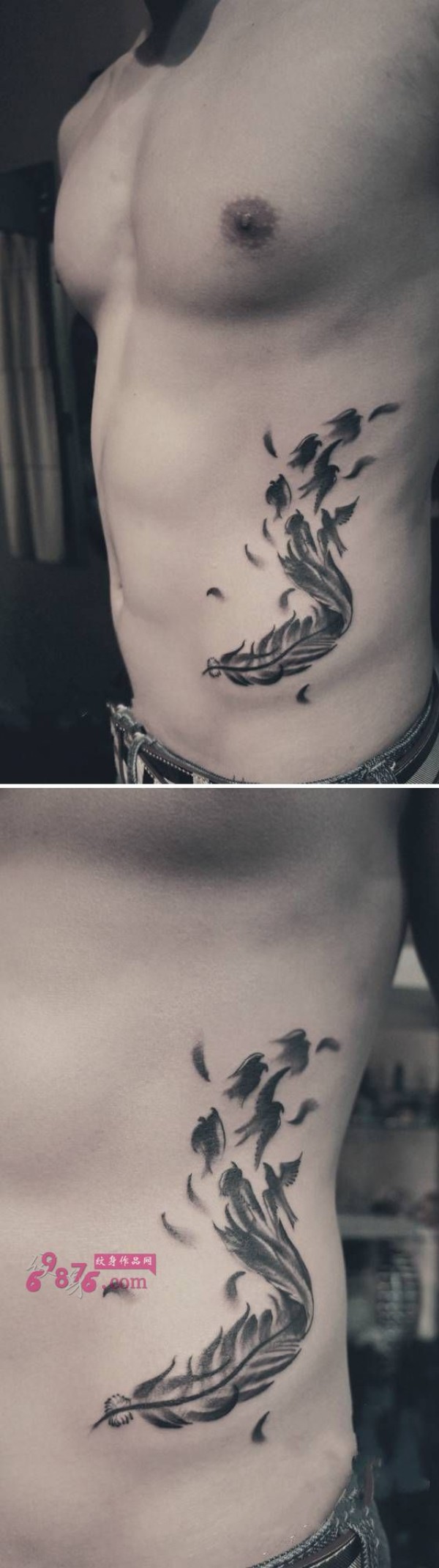 男人侧腰羽毛小鸟个性纹身_腰部纹身图案大全_纹身图吧