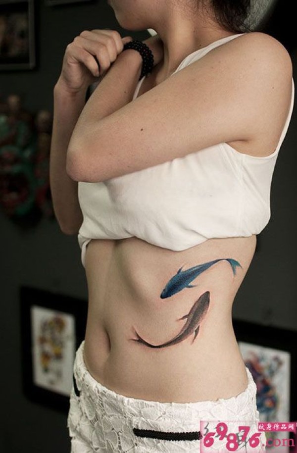 水墨风双鲤鱼腰部纹身_腰部纹身图案大全_纹身图吧