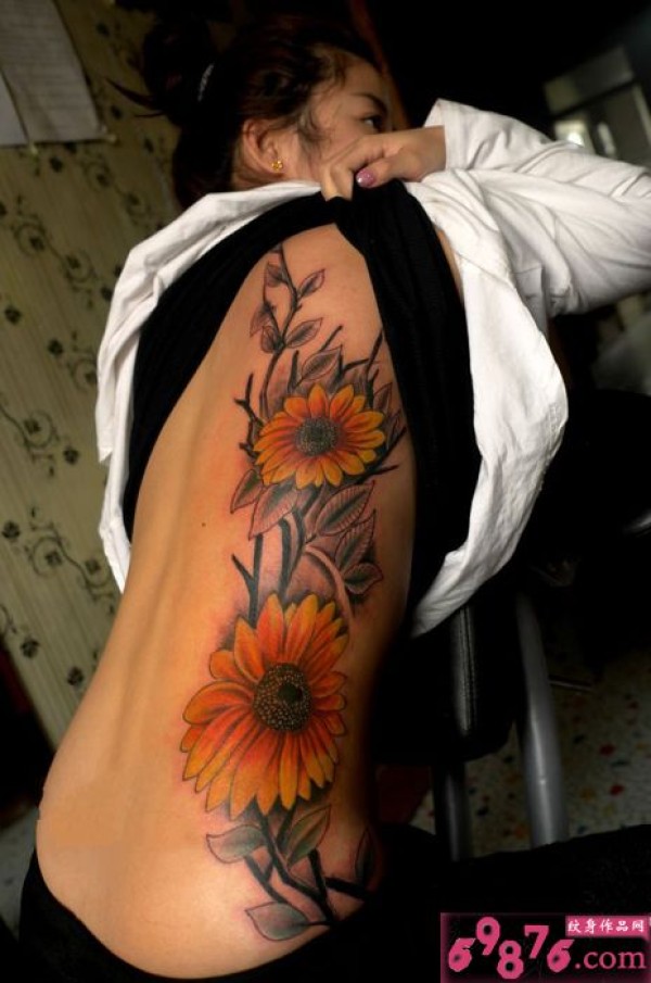 美女侧腰盛开向日葵纹身_腰部纹身图案大全_纹身图吧