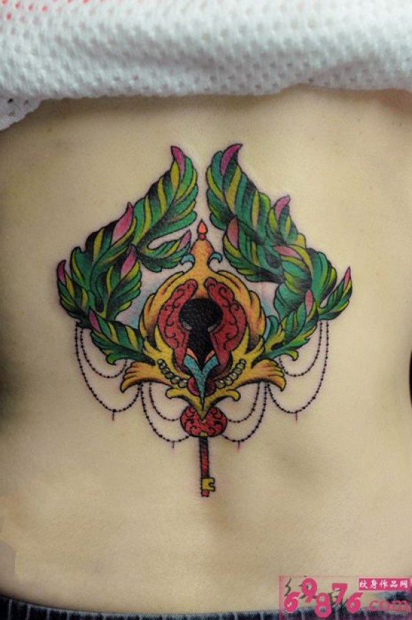 创意羽毛钥匙孔腰部纹身_腰部纹身图案大全_纹身图吧