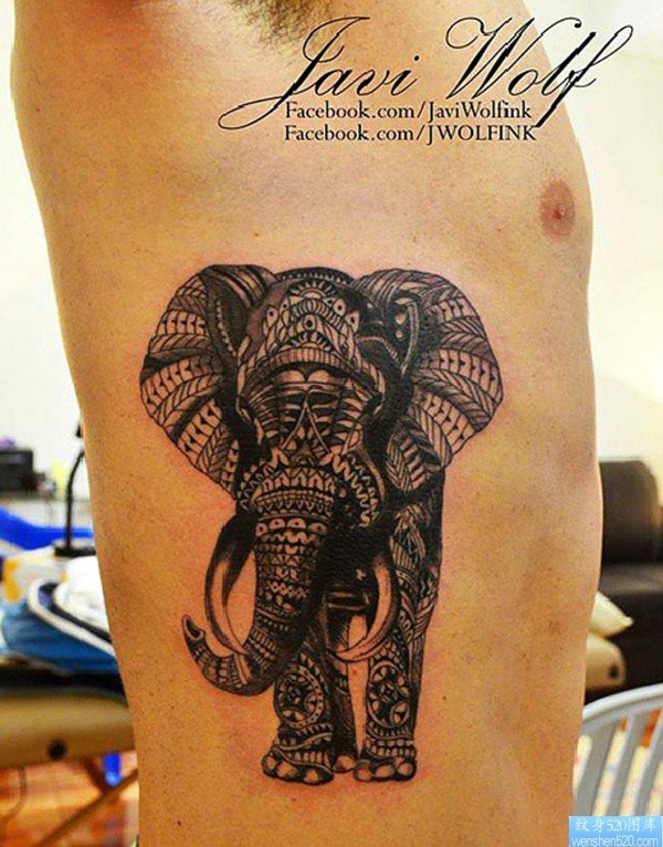 侧腰上一幅精致的大象纹身图片_腰部纹身图案大全_纹身图吧