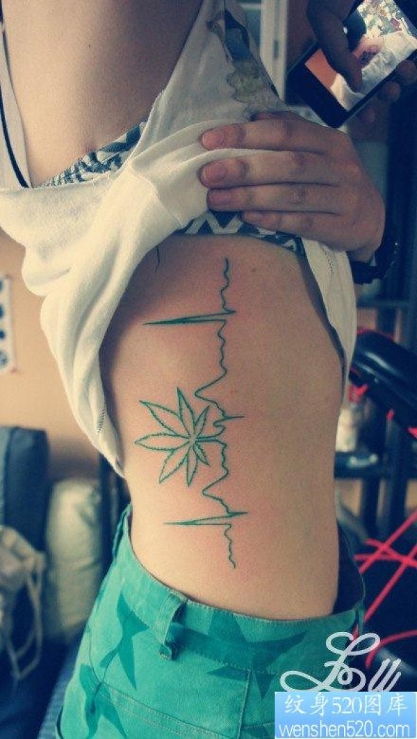 美女侧腰经典的大麻叶心电图纹身图片_腰部纹身图案大全_纹身图吧