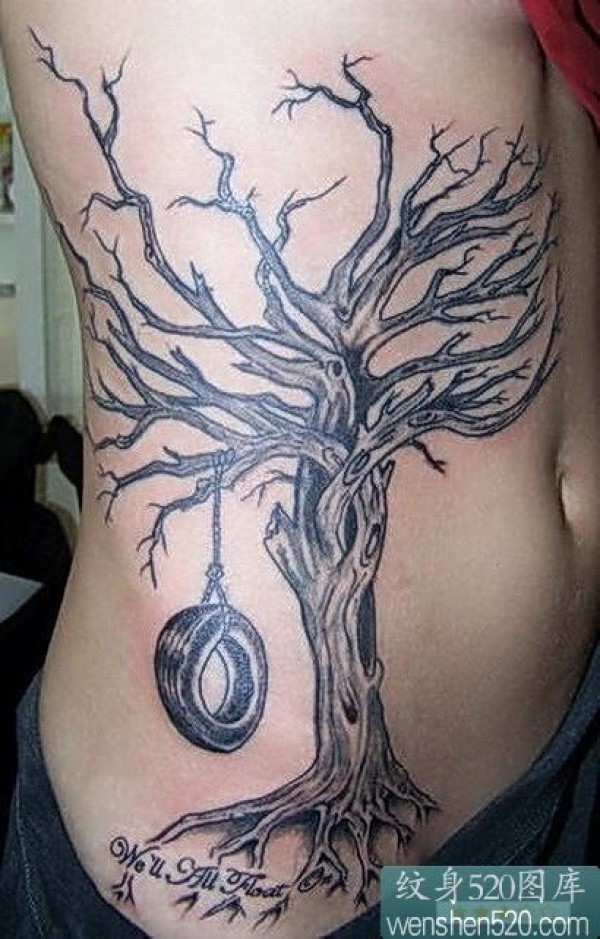 腰部枯树和轮胎个性的纹身作品_腰部纹身图案大全_纹身图吧