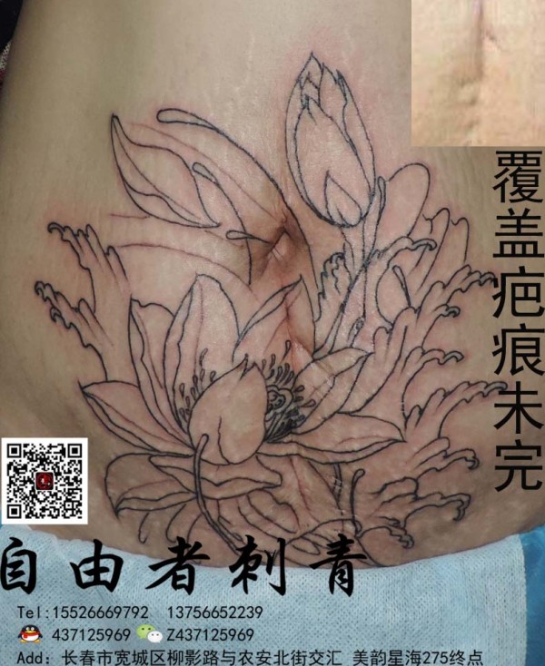 荷花覆盖疤痕纹身等纹身上色完成,就丝毫看不_腰部纹身图案大全_纹身图吧