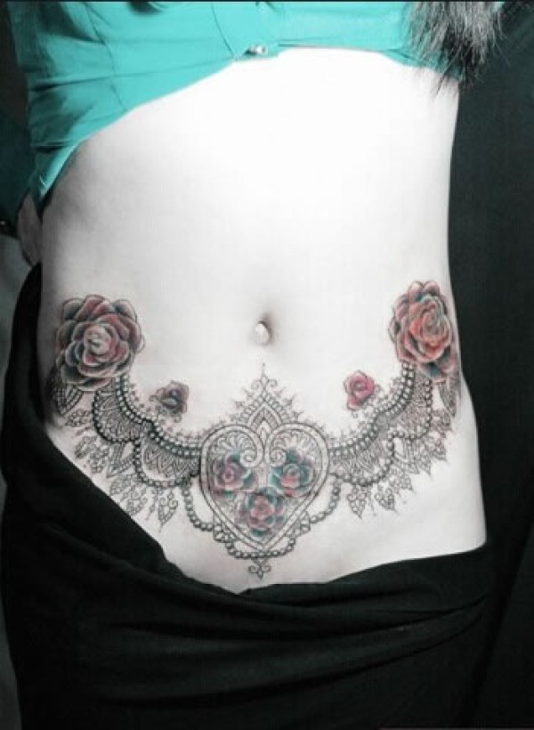 性感腹部上的装饰心形花纹纹身_腰部纹身图案大全_纹身图吧