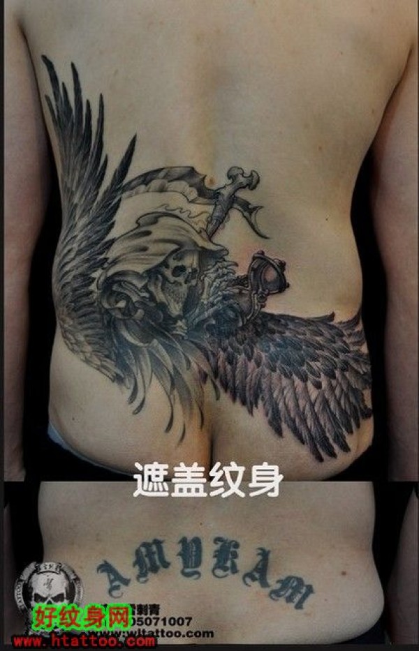 帅哥腰上黑白死神遮盖纹身图案_腰部纹身图案大全_纹身图吧