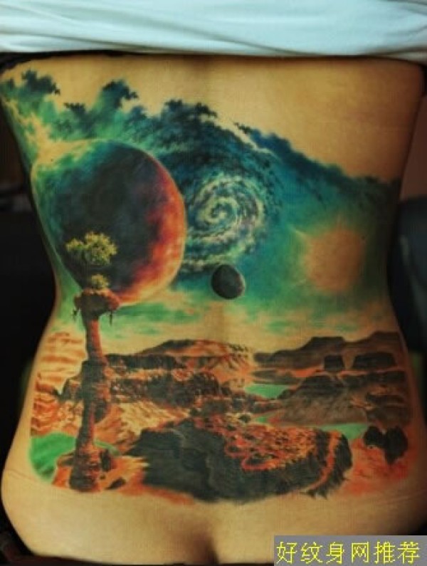 美女后背上彩色的星系图案纹身异域星系纹身是_腰部纹身图案大全_纹身图吧