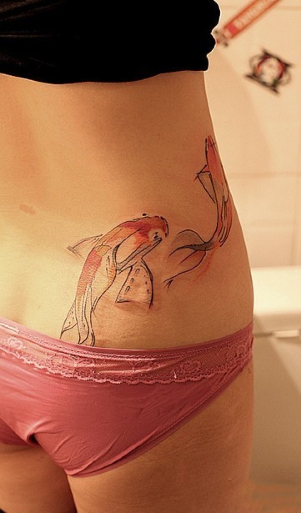 女生腰部很有动态感的金鱼纹身图水墨风格的金_腰部纹身图案大全_纹身图吧