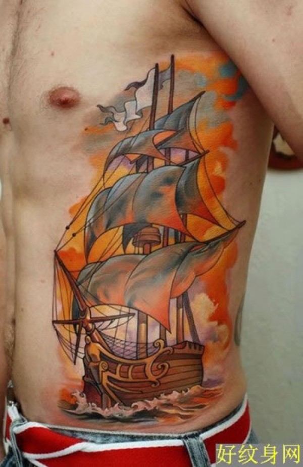 随风起航的帆船纹身图案大全彩色的帆船图案纹_腰部纹身图案大全_纹身图吧