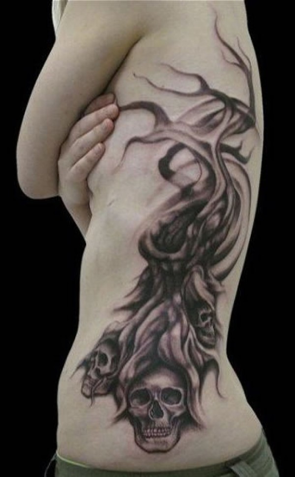 腰部骷髅头纹身,美女也喜欢骷髅头纹身盘在树_腰部纹身图案大全_纹身图吧