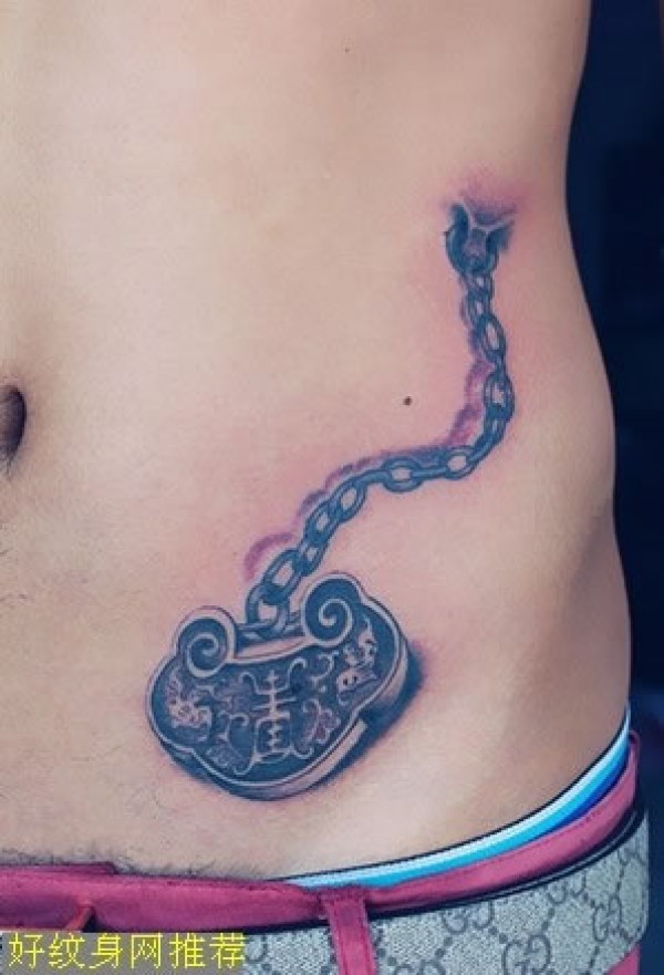 腰间象征爱情的同心锁纹身图案男士侧腰上带链_腰部纹身图案大全_纹身图吧