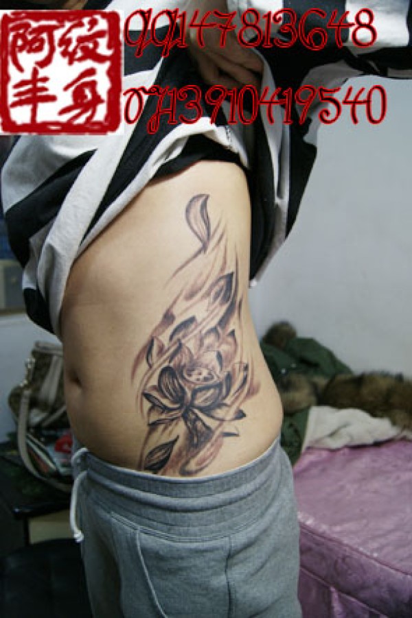 腰侧上好看的荷花纹身图片侧腰上带浅色流云的_腰部纹身图案大全_纹身图吧