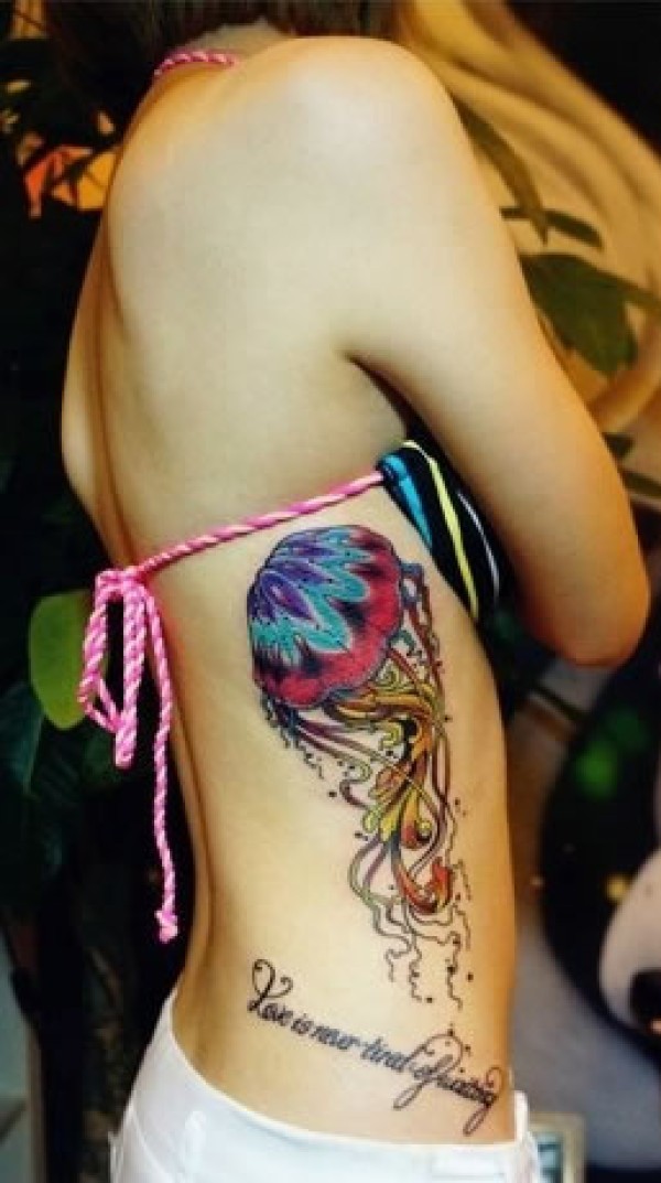 美女腰部色彩斑斓的彩色水母纹身图案美女腰部_腰部纹身图案大全_纹身图吧