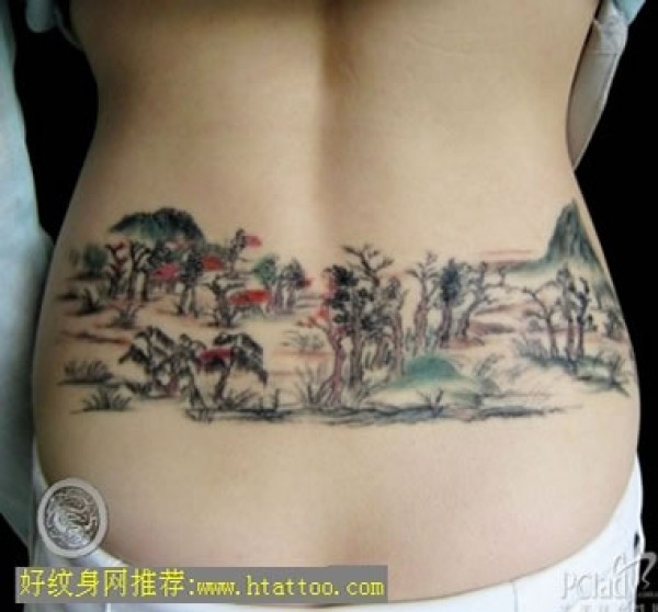 腰部水墨画风格风景图案纹身作品好漂亮的风景_腰部纹身图案大全_纹身图吧