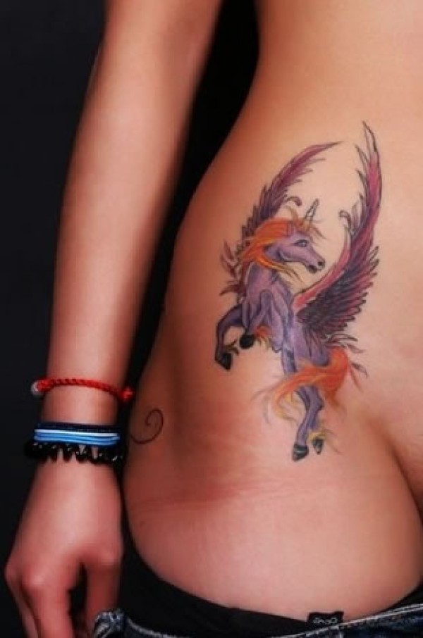 侧腰上腾飞的彩绘独角兽纹身图侧腰上展翅高飞_腰部纹身图案大全_纹身图吧