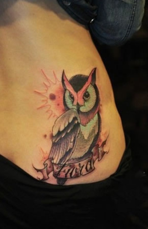 站在侧腰上的彩绘猫头鹰纹身图目光炯炯有神的_腰部纹身图案大全_纹身图吧