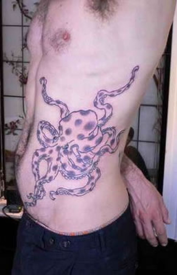 腰部素色的乌贼纹身图挥舞着多只触手的乌贼图_腰部纹身图案大全_纹身图吧