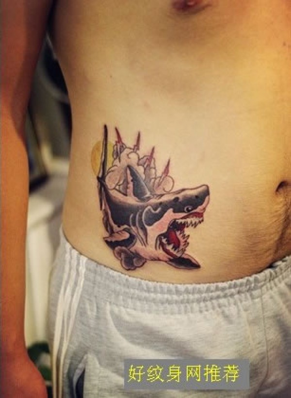 腰部有着锋利牙齿的鲨鱼纹身图案这样的动物纹_腰部纹身图案大全_纹身图吧