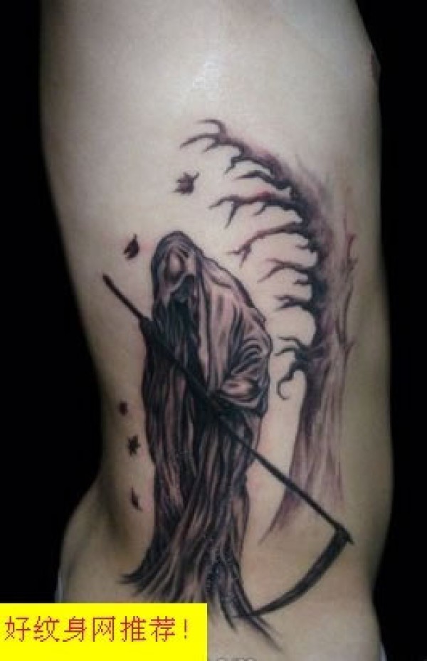 侧腰上素色的死神纹身图侧腰上手拿镰刀的死神_腰部纹身图案大全_纹身图吧