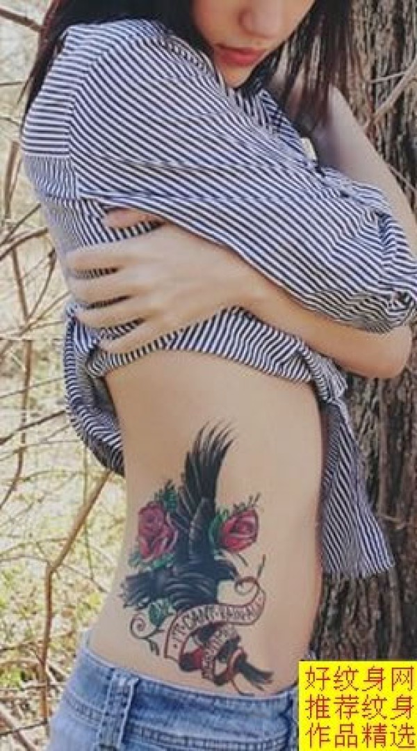 窈窕腰部的雄鹰纹身图黑色的雄鹰加花带字母图_腰部纹身图案大全_纹身图吧