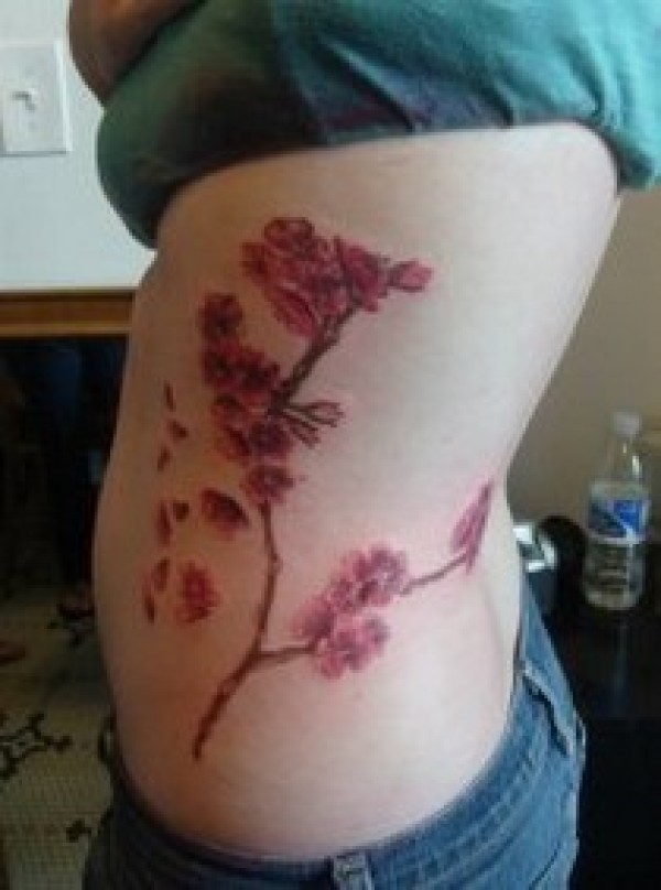 丰腴美女腰部的樱花图案纹身艳红色的花朵色体_腰部纹身图案大全_纹身图吧