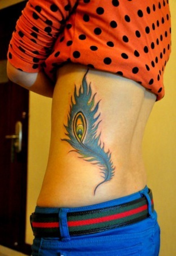女生腰部蓝色的羽毛纹身图片我猜纹身里边的羽_腰部纹身图案大全_纹身图吧