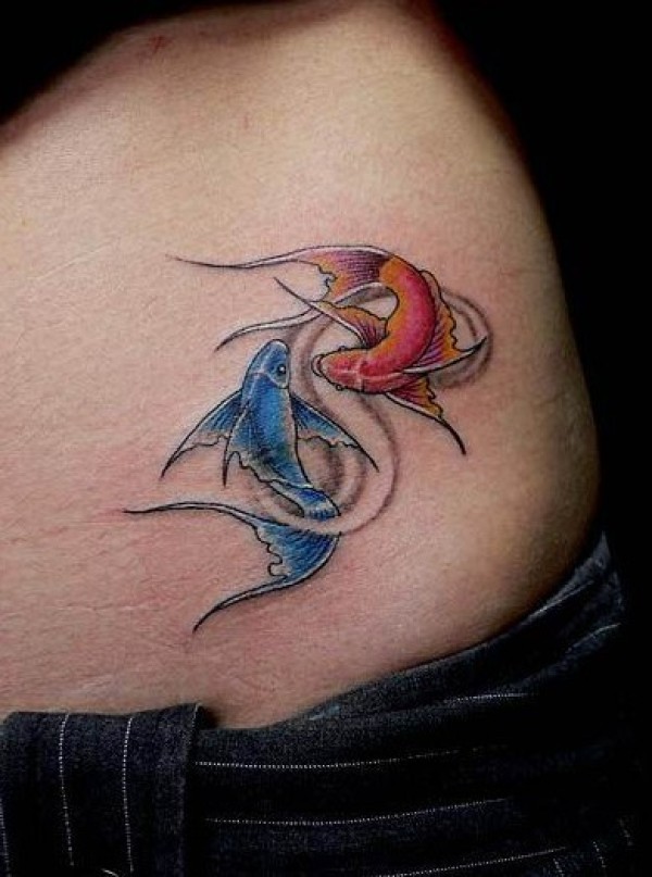 腰部彩色游鱼纹身,鱼儿也会拼八卦图吗_腰部纹身图案大全_纹身图吧