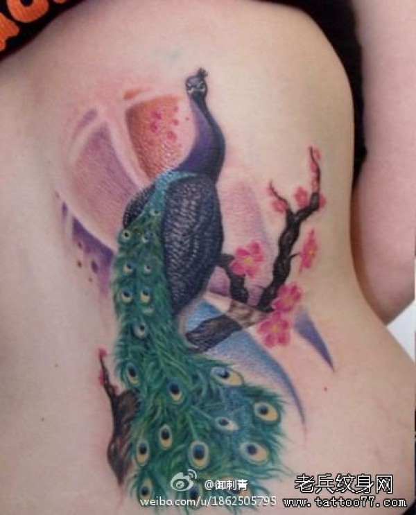 女人后腰漂亮的一款彩色孔雀纹身图案_腰部纹身图案大全_纹身图吧