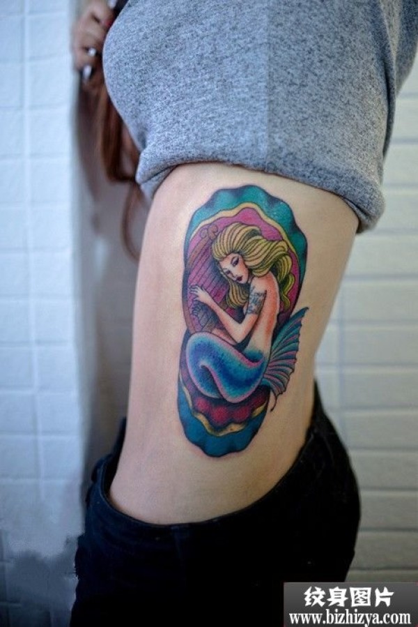 侧腰美人鱼贝壳纹身图案图片_腰部纹身图案大全_纹身图吧