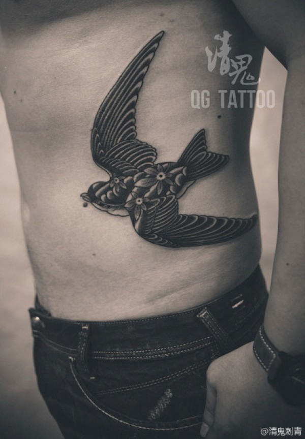 男生腰部潮流时尚的黑灰燕子纹身图案_腰部纹身图案大全_纹身图吧