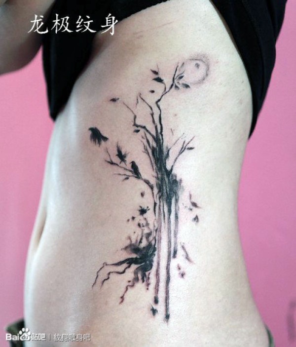 女孩子侧腰时尚精美的写意小树与小鸟纹身图案_腰部纹身图案大全_纹身图吧