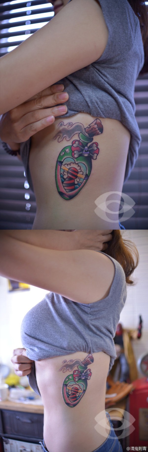 美女侧腰潮流经典的瓶子纹身图案_腰部纹身图案大全_纹身图吧