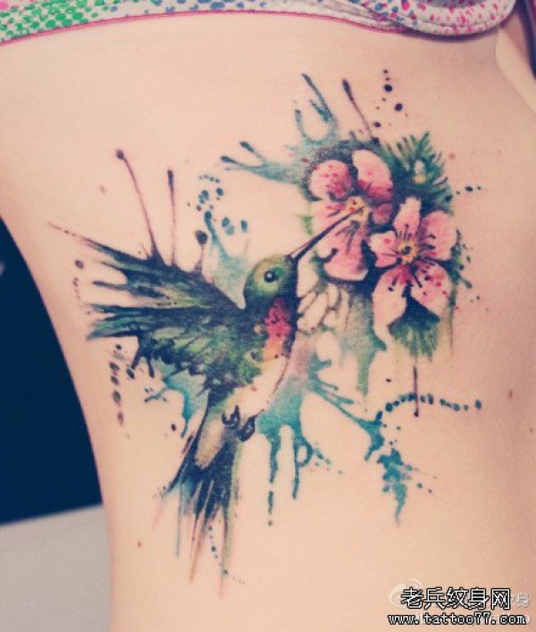 美女侧腰漂亮的蜂鸟与花卉纹身图案_腰部纹身图案大全_纹身图吧