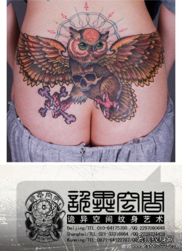 男人后腰超酷的猫头鹰纹身图案_腰部纹身图案大全_纹身图吧