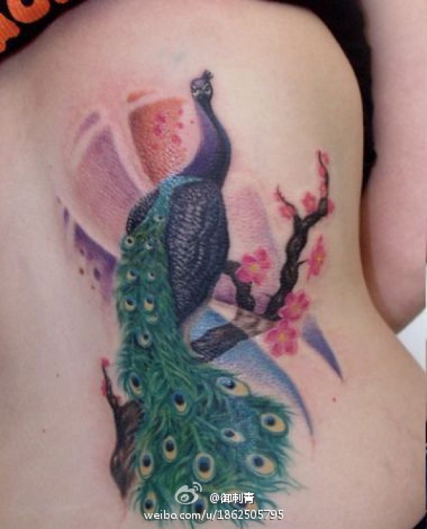 美女腰部漂亮潮流的孔雀纹身图案_腰部纹身图案大全_纹身图吧