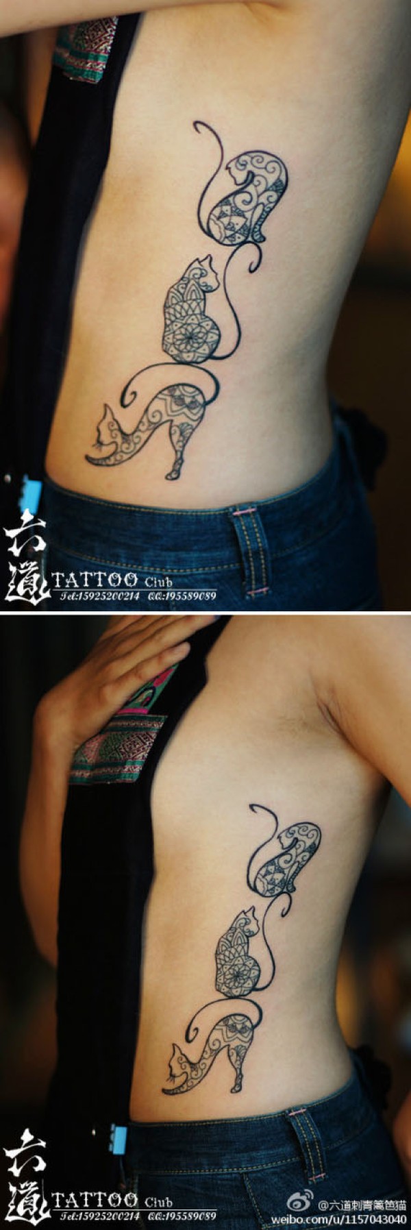 美女腰部可爱流行的猫咪纹身图案_腰部纹身图案大全_纹身图吧