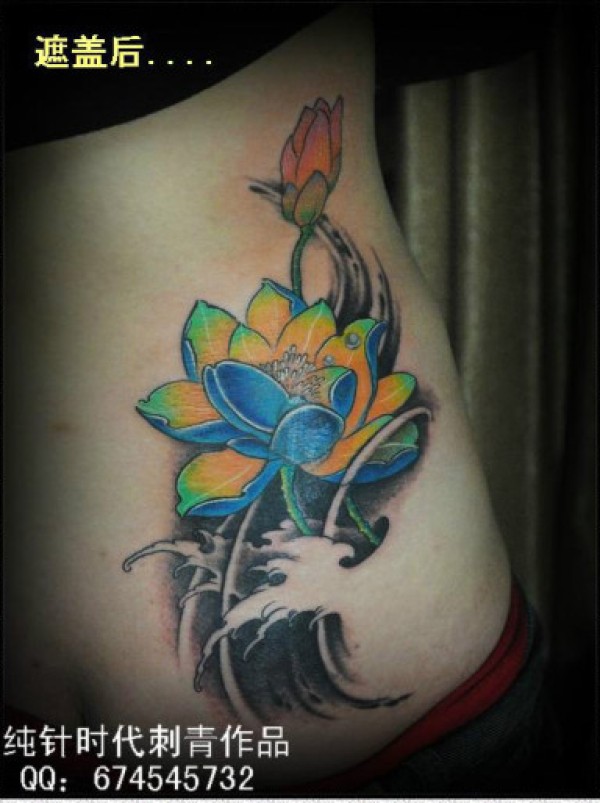 美女腰部唯美漂亮的彩色莲花纹身图案_腰部纹身图案大全_纹身图吧