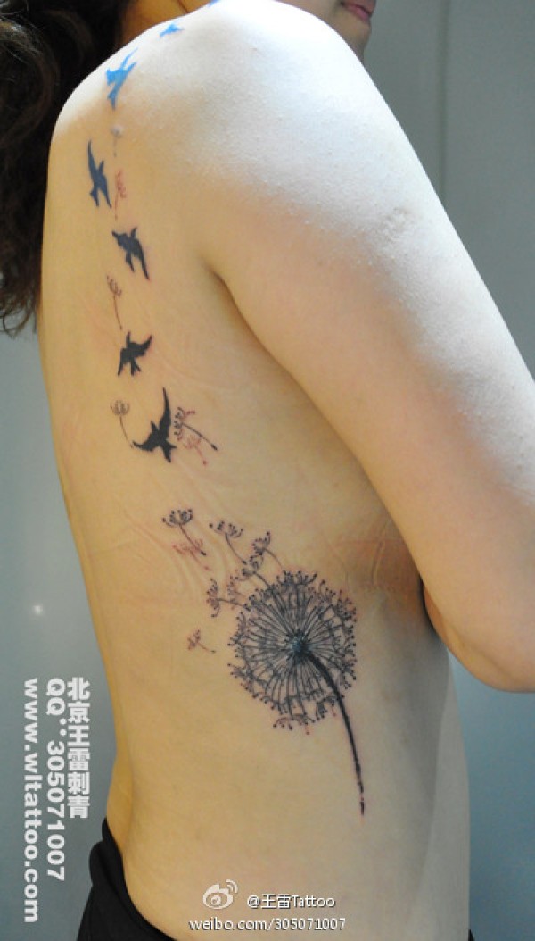 女孩子侧腰好看时尚的蒲公英燕子纹身图案_腰部纹身图案大全_纹身图吧