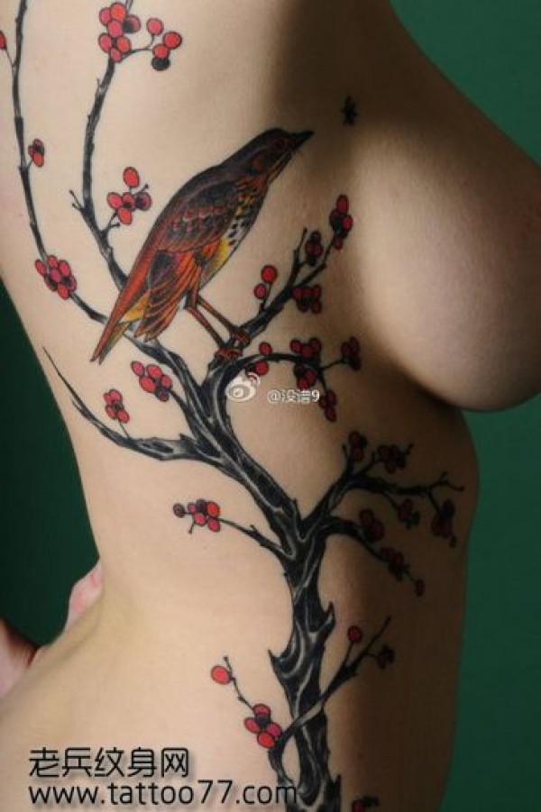 美女侧腰梅花喜鹊纹身图案_腰部纹身图案大全_纹身图吧