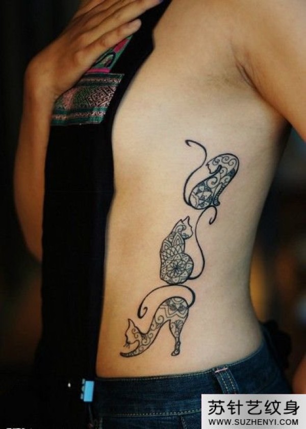 侧腰梵花猫咪最新刺青_腰部纹身图案大全_纹身图吧