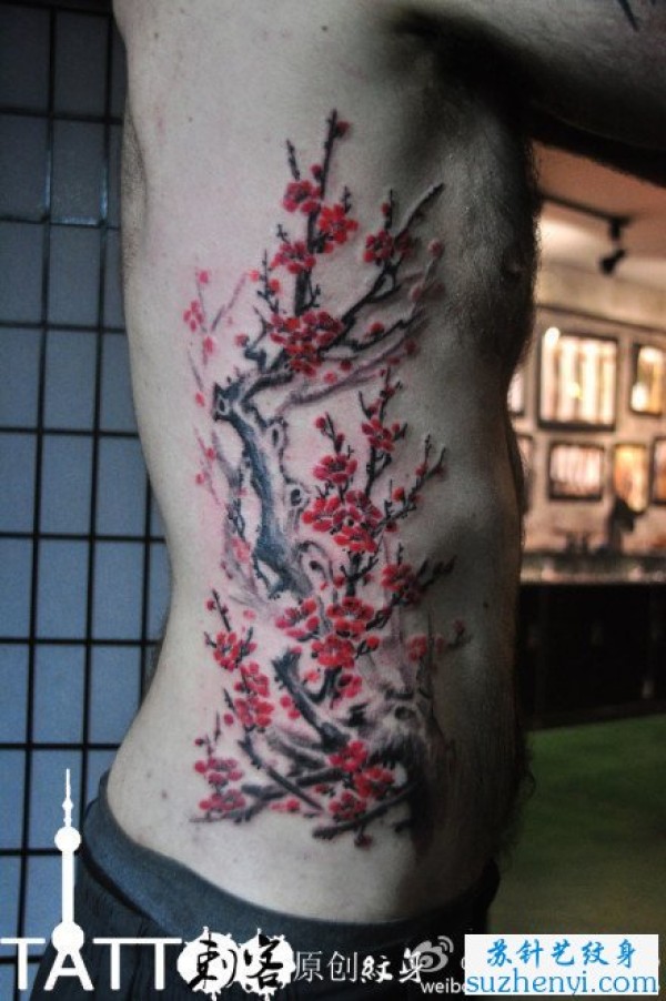 腰部时尚精美的水墨梅花纹身_腰部纹身图案大全_纹身图吧