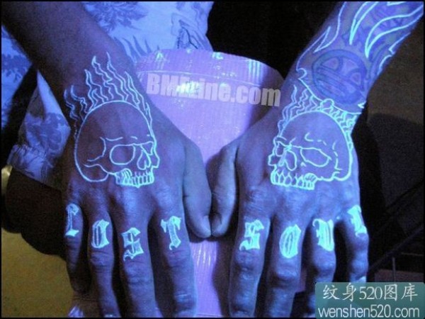 手背上的荧光骷髅头和字母_荧光纹身图案大全_纹身图吧