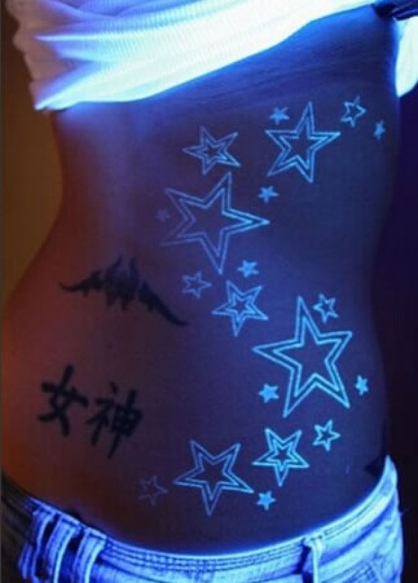 在黑暗中绽放美丽的荧光纹身美女腰部五角星图_荧光纹身图案大全_纹身图吧