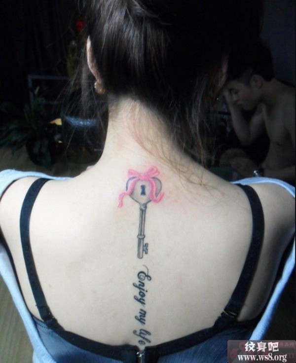 女生背部粉色钥匙fenseyaoshi英文字母图_英文纹身图案大全_纹身图吧