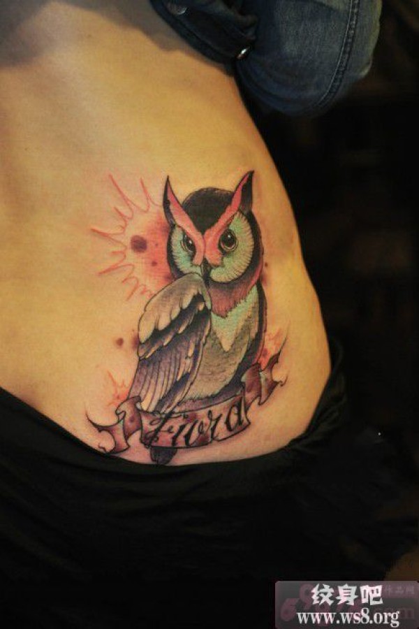 腰部创意猫头鹰英文刺青图案_英文纹身图案大全_纹身图吧