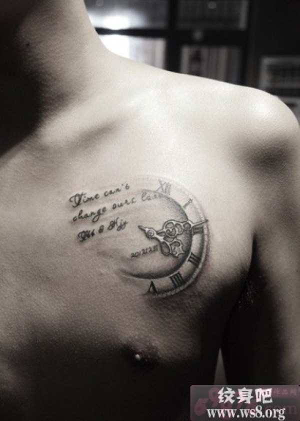 胸口时钟英文黑白纹身_英文纹身图案大全_纹身图吧